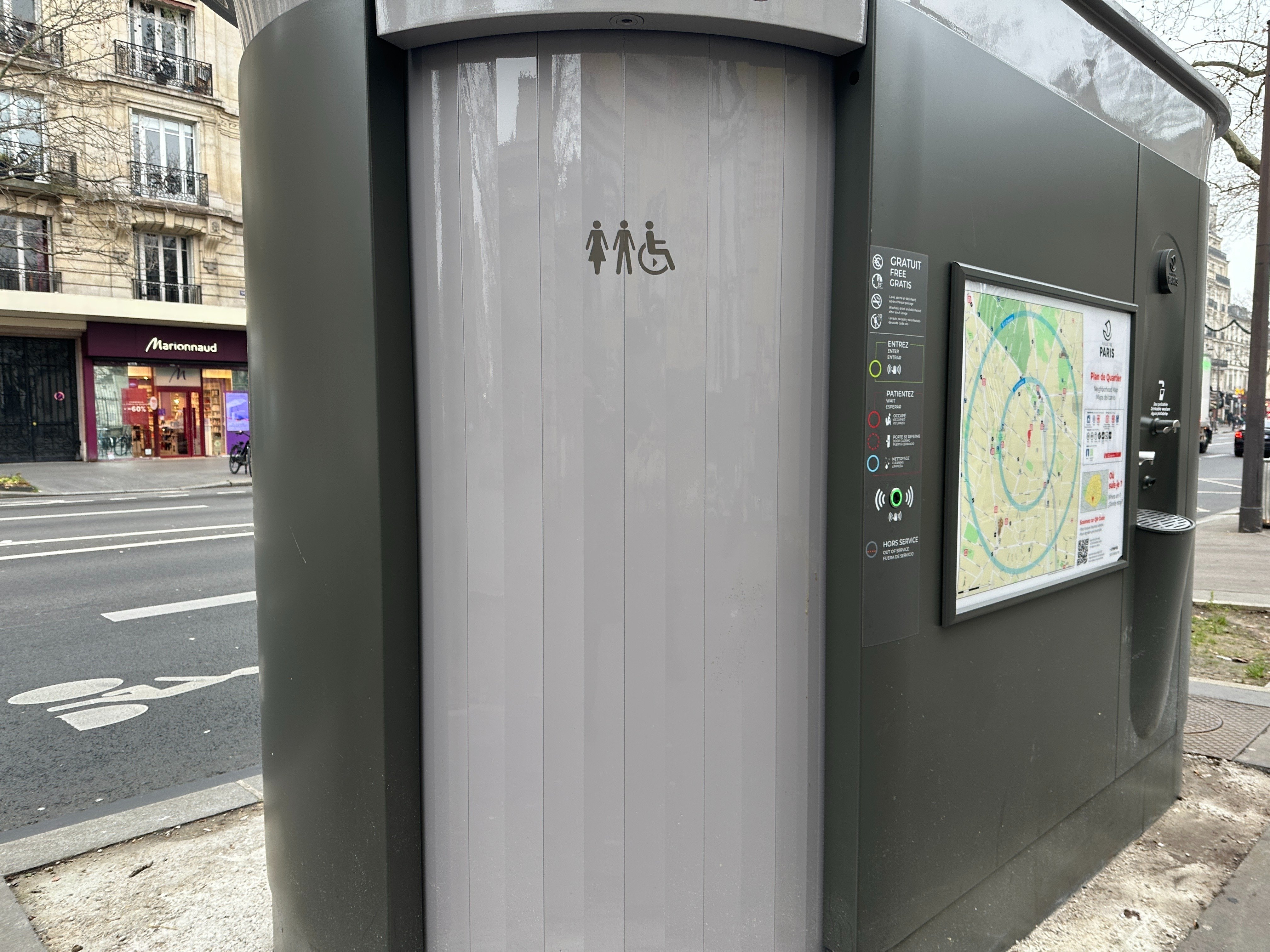 パリのサニゼットの安全性について:使用後に自動洗浄される/一人用個室/故障もあるため見極めが必要/人通りの多い明るい場所を選ぶのが無難。